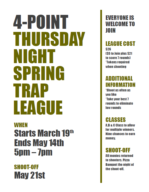 The league starts on the 19th. March 19th is coming soon! Spring is just around the corner and its time for the Spring league to start up! Come on out on Thursday night to Four Point Gun Club. Sign up and compete in the In-house Four Point Gun Club League.